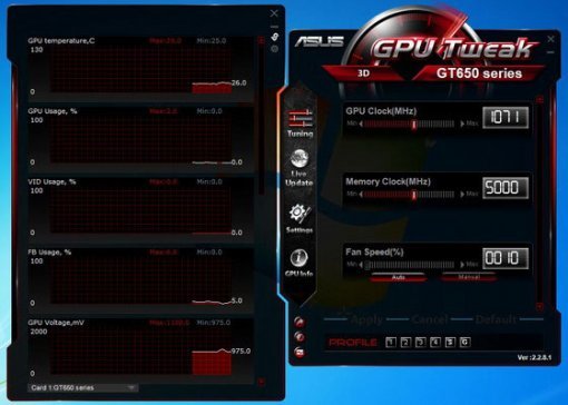 그 외에도 에이수스 GTX650 ECO는 사용자가 직접 오버클러킹을 할 수 있는 'GPU 트윅(Tweak)'이라는 응용프로그램을 함께 제공한다. 이를 이용하면 GPU 및 메모리의 클럭, 그리고 냉각팬의 회전 속도 등을 사용자가 직접 조정할 수 있으며, 이 과정에서 GPU의 온도 및 전압, 그리고 사용량 등을 실시간 모니터링 할 수도 있게 되어있다. 초보자라면 되도록 손을 대지 않은 것이 좋겠지만 실험정신이 투철한 매니아라면 그냥 지나치기 어려울 것이다.