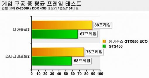테스트 결과, 에이수스 GTX650 ECO 기반의 시스템은 지포스 GTS450 기반의 시스템에 비해 평균 20% 정도 우수한 프레임을 기록했다. 그래픽카드를 제외한 다른 모든 구성품이 동일했으니 이는 그래픽카드의 성능향상에 의한 결과라고 볼 수 있다.