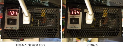 게임 성능 향상만큼이나 인상적인 것은 전력 소모량이다. 운영체제 부팅 후 5분 정도가 지난 유휴 상태에서 기존 지포스 GTS450 기반의 시스템은 60W(와트) 초반의 전력을 소모했으나 에이수스 GTX650 ECO 기반의 시스템은 50W 중반의 전력을 소모하는 것을 확인할 수 있었다.