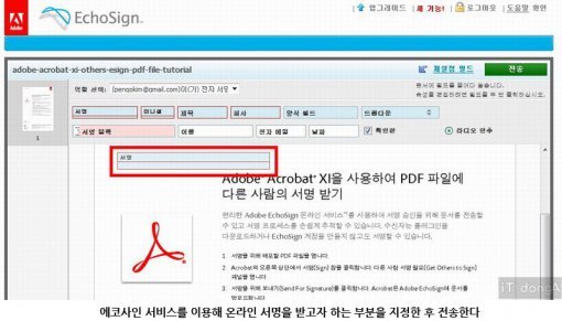 이 기능을 이용하려면 일단 서명을 요청하는 측이 어도비의 전자서명 전문 서비스인 '에코사인(EchoSign)'에 가입을 해야 한다(가입비 무료). 가입이 된 상태라면 서명을 받아야 하는 PDF 파일을 애크로뱃 11 프로로 연 후 '파일' 항목의 '문서에 서명하기'를 선택해 서명 관련 메뉴를 연다. 여기서 '다른 사람 서명 필요' 탭의 '서명을 위해 보내기'를 선택하면 에코사인 사이트로 해당 PDF 문서가 전달됨과 동시에 이 사이트로 이동하는 링크가 뜬다. 이 링크를 클릭하면 발신자와 수신자의 이메일 주소를 입력하고 해당 문서의 어느 부분에 서명을 받아야 하는지를 지정할 수 있게 된다.
