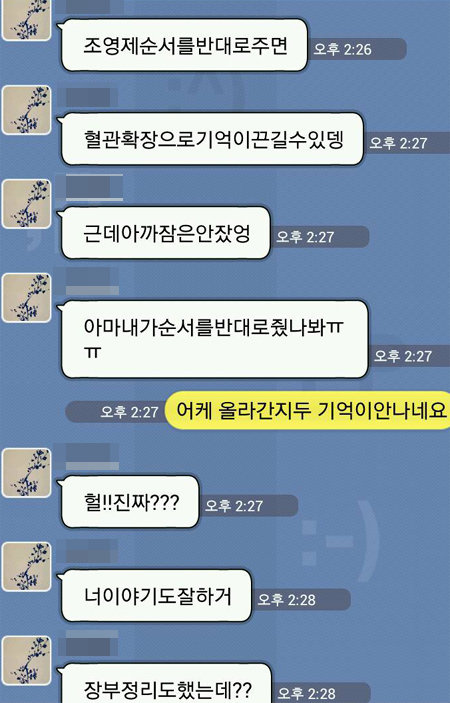 레지던트 정모 씨가 지난달 19일 인턴 김모 씨에게 보낸 문자메시지. 정 씨는 기억나지 않는다는 김 씨에게 ‘너 이야기도 잘하고 장부정리도 하던데?’라고 답문자를 보냈다. 휴대전화 화면 캡처