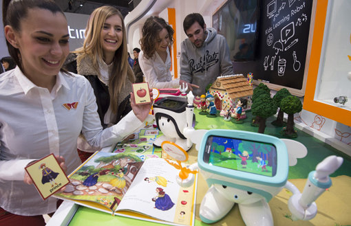 SK텔레콤은 25일(현지시간) 스페인 바르셀로나에서 개막한 ‘모바일 월드 콩그레스2013’(MWC 2013)에서 유아 교육용 로봇 ‘아띠’를 처음 공개했다.