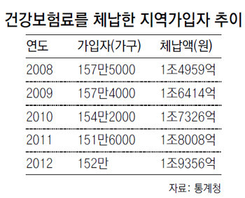 경기 불황이 오래 이어지면서 6개월 이상 건강보험료를 내지 못한 지역가입자가 크게 늘어났다. 24일 국민건강보험공단에 따르면 지난해 말 기준으로 건강보험료를 6개월 이상 체납한 지역가입자가 152만 가구로 1년 전보다 2만 가구 늘었다. 보험료 체납액은 2011년 1조8008억 원에서 지난해 말 1조9356억 원으로 7.5% 증가했다.