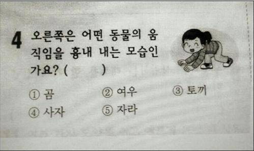 그림에는 사람이 네발로 기는 모습이다. 보기 속의 동물이 모두 네발로 다니는 동물이어서 정답이 애매모호하다.