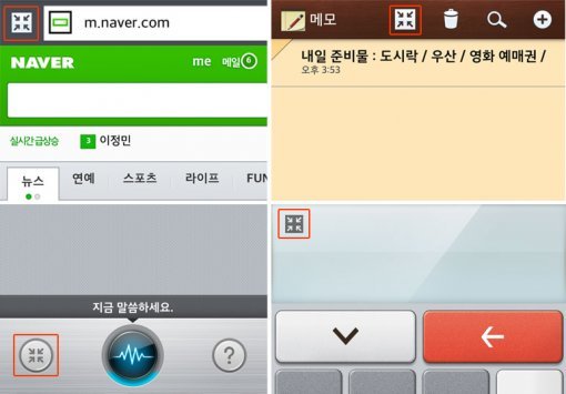 사용 방법은 간단하다. Q슬라이드 앱을 실행하면 한 구석에 네모 모양 버튼(네모 안에 화살표 4개가 그려진 버튼)이 있을 것이다. 이 버튼을 누르기만 하면 된다. 예를 들어 인터넷은 인터넷 주소창 왼쪽에, 비디오는 화면 상단 오른쪽에, 메모는 상단 메뉴 중에 있다.