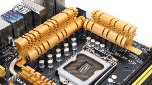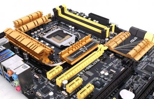 Z87-DELUXE는 기판의 모양만 봐도 뭔가 비싸보이는 느낌이다(실제로도 40만원대의 고가 제품이다). 특히 황금색으로 번쩍이는(물론 실제 황금은 아니고 알루미늄 재질이다) 다수의 방열판이 눈에 띄는데, 칩셋은 물론이고 CPU 소켓 주변의 전원부도 제법 큰 방열판과 히트파이프로 감싸 발열에 대비했다. 그 외에 각종 포트나 슬롯에도 부분적으로 황금색을 도입해 시각적인 만족감을 높였다.