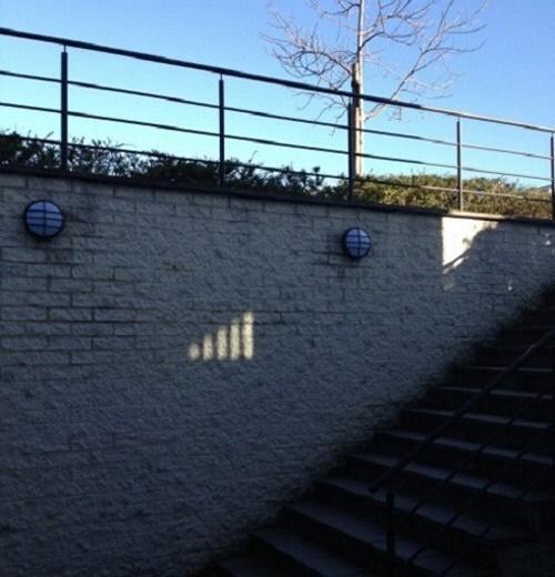 이 사진은 한 건물 계단 벽쪽에 비친 독특한 햇빛을 담은 것이다.