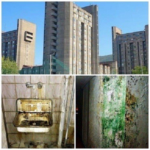 공개된 사진 속에는 기숙사의 외관과 건물 내부가 담겨 있다. 세련된 고층 건물과 달리 기숙사 내부의 화장실 세면대는 물이 흥건하고 대부분 녹이 슬어 있는 모습이다.
