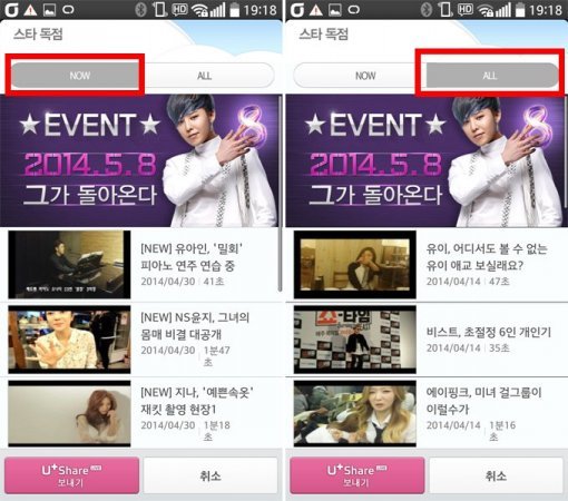 스타 독점에서는 인기 연예인 인터뷰, 공연 연습, 화보나 앨범 재킷 촬영, 일상생활 등의 동영상 콘텐츠를 보고, 이를 친구와 공유할 수 있다. 특히 여기서 볼 수 있는 동영상은 U+Share LIVE에서만 단독으로 공개하기 때문에, 팬이라면 놓치고 싶지 않은 콘텐츠다. 유아인 피아노 연주 연습, 지나 속옷 재킷 촬영 현장, 에이핑크 무대 뒷 이야기 영상 등 스타들의 또 다른 모습들을 볼 수 있다. 상단 메뉴에서 'NOW'를 선택하면 최신 동영상을 확인할 수 있다. 콘텐츠는 일주일에 한 번씩 업데이트 되며, 이전 동영상을 보려면 상단 메뉴에서 'ALL'을 선택하면 된다.