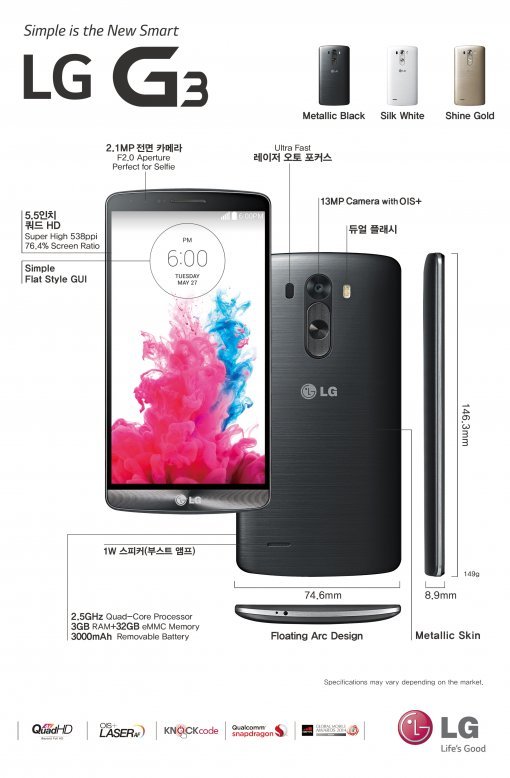 LG전자에 따르면 ‘G3’는 쿼드HD IPS 디스플레이가 적용됐다. 또한 빠르게 초점을 잡아주는 레이저 오토 포커스 카메라, 사용자 중심의 UX(사용자 경험) 등이 특징이다.