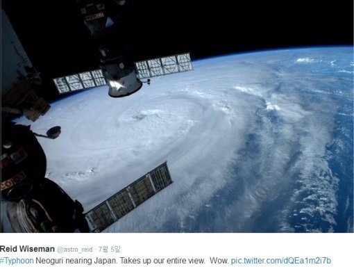 와이즈먼 씨는 자신의 트위터를 통해 “너구리가 일본에 가깝게 접근했다”는 글과 함께 사진을 올렸다. 이는 고도 약 400㎞ 상공에서 지구 궤도를 도는 국제 우주정거장에서 촬영한 것이다. 흰 구름이 태풍 너구리의 소용돌이로 전해졌다.