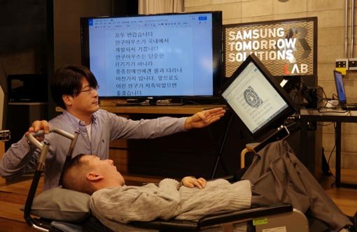 삼성전자는 25일 서울 서초사옥 투모로우 솔루션랩에서 안구마우스 차세대 버전인 ‘아이캔플러스(EYECAN+)’를 시연하는 행사를 가졌다. 안구마우스는 컴퓨터의 마우스 조작을 손대신 눈동자로 할 수 있게 해주는 장치. 몸을 전혀 움직일 수 없는 사람도 눈동자의 움직임만으로 글을 쓰고, 컴퓨터를 제어해 인터넷을 이용할 수 있다.