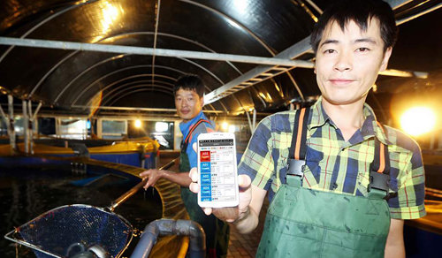 전북 고창군의 한 장어 양식장 직원이 양식장통합관리를 할 수 있는 스마트폰 애플리케이션을 소개하고 있다. SK텔레콤 제공