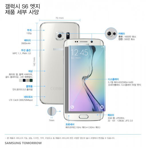 갤럭시 S6와 갤럭시 S6 엣지는 다음달 10일 출시된다. 메모리 용량은 32·64·128GB(기가바이트) 등 3종이다. 색상은 화이트 펄, 블랙 사파이어, 골드 플래티넘 등 3종, 갤럭시 S6는 블루 토파즈, 갤럭시 S6 엣지는 그린 에메랄드가 포함돼 총 4종이다.