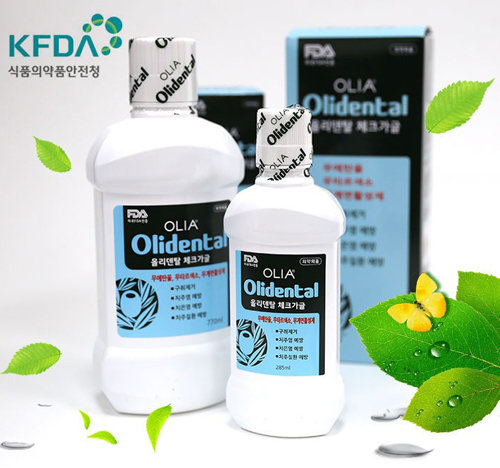 올리덴탈 체크가글은 구강 청결에 효과가 있는 녹차, 레몬오일, 올리브 잎 추출물 성분등의 천연원료로 제조되었으며, 無타르색소, 無알코올, 無계면활성제 제품으로, 효과가 일시적이고 침을 마르게 해 되려 구강건강에 해를 끼칠 수 있는 시중의 알코올 함유 제품과 차별화된다.