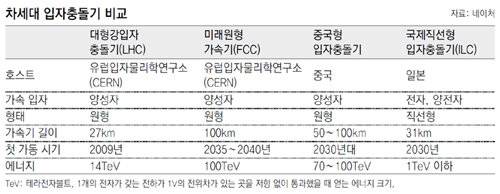 이런 가속기 거대화 경쟁에서 가장 앞선 곳은 역시 유럽이다. CERN은 2025년부터 둘레 약 100km로 LHC의 3배가 넘는 ‘미래원형가속기(FCC·Future Circular Collider)’ 건설을 시작할 계획이다. 2035년부터 2040년 사이에 가동을 시작할 예정으로 기존 LHC보다 충돌 에너지가 7배가량 크다. 힉스 입자를 대량으로 만들 것으로 기대돼 ‘힉스 팩토리’라고도 부른다.