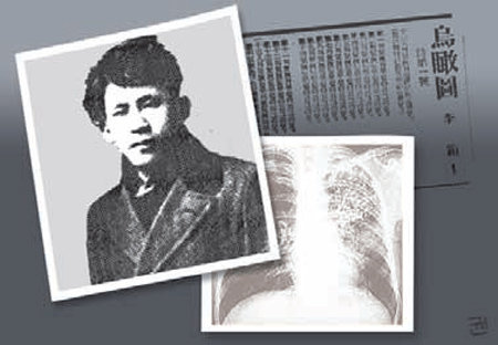 그가 25세가 되던 여름, 연작시 ‘오감도(烏瞰圖)’에 악화되어가는 폐결핵 환자 본인의 모습을 ‘까마귀의 눈으로’ 파격 조감했다. 하지만 당시 문단과 독자들은 그의 작품에 냉소적이었다. 게다가 결핵균 상태를 확인하기 위해 거듭 시행한 객담 도말검사에서는 지속적으로 균 양성반응이 나왔던 모양이다. 매일같이 총을 쏘듯 게워내는 객혈과 양쪽 폐 X선 그림자의 축 처진 날개는 작가를 점차 죽음으로 몰아갔다.