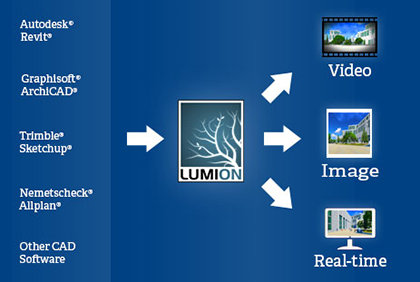 루미온은 네덜란드의 SW 기업 '루미온3D'가 개발한 렌더링 SW다. 루미온은 오토데스크 '오토캐드', '레빗', '마야', '3DS 맥스', 그래피소프트의 '아치캐드', 트림블의 '스케치업' 등 BIM(Building information modeling, 건물 설계 도면)과 3D 모델링 SW에서 만들어진 도면을 바탕으로 건축물의 3D 모델을 자동으로 만들어주는 SW다. 3D 모델을 자동으로 만들어줄 뿐만 아니라, 만들어진 3D 모델에 사람, 사물, 자연 환경 등을 추가로 배치할 수도 있다. '자동 3D 렌더링 + 모델 꾸미기'를 지원하는 SW라고 생각하면 된다.
