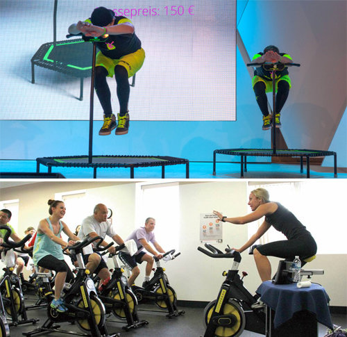 트램펄린 위에서 복근을 사용해 뛰어오르는 점핑피트니스(위)와 고정식 사이클 위에서 여러 동작을 수행하며 운동하는 스피닝(아래)이 최근 인기다. 재미와 함께 칼로리 소비가 높다는 장점이 있다. Flickr·위키미디어 제공