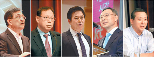 국내외적으로 경제상황을 예측하기 어려워지면서 국내 주요 정보통신기술 기업들의 대책마련 발길이 분주하다. 기업 수장들의 신년사에서도 굳은 결의와 각오가 느껴진다. 삼성전자 권오현 부회장, LG전자 조성진 부회장, SKT 박정호 사장, KT 황창규 회장, LG유플러스 권영수 부회장(맨 왼쪽부터).