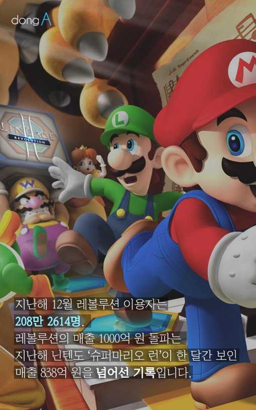 #3 지난해 12월 레볼루션 이용자는 208만 2614명. 레볼루션의 매출 1000억 원 돌파는 지난해 닌텐도 '슈퍼마리오 런'이 한 달간 보인 매출 838억 원을 넘어선 기록입니다.