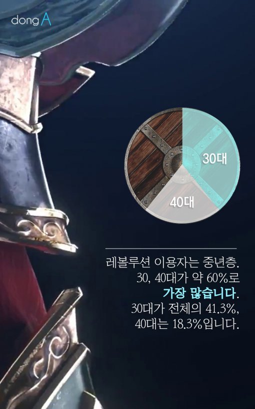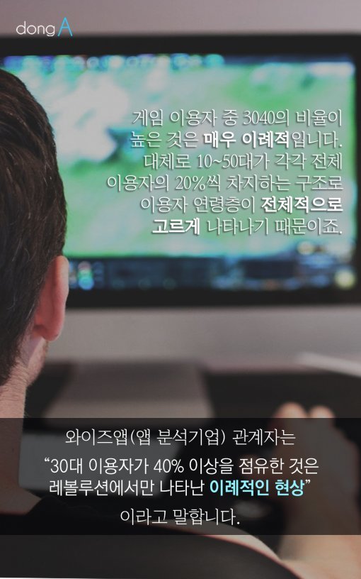 #5 게임 이용자 중 3040의 비율이 높은 것은 매우 이례적입니다. 대체로 10~50대가 각각 전체 이용자의 20%씩 차지하는 구조로 이용자 연령층이 전체적으로 고르게 나타나기 때문이죠. 와이즈앱(앱 분석기업) 관계자는 "30대 이용자가 40% 이상을 점유한 것은 레볼루션에서만 나타난 이례적인 현상"이라고 말합니다.