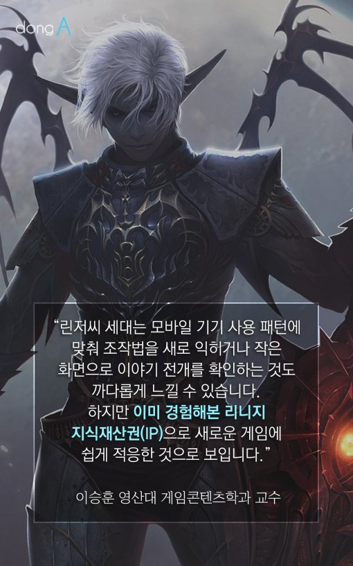 #7 "린저씨 세대는 모바일 기기 사용 패턴에 맞춰 조작법을 새로 익히거나 작은 화면으로 이야기 전개를 확인하는 것도 까다롭게 느낄 수 있습니다. 하지만 이미 경험해본 리니지 지식재산권(IP)으로 새로운 게임에 쉽게 적응한 것으로 보입니다." - 이승훈 영산대 게임콘텐츠학과 교수