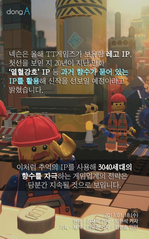 #10 넥슨은 올해 TT게임즈가 보유한 레고 IP, 첫선을 보인 지 20년이 지난 만화 '열혈강호' IP 등 과거 향수가 묻어 있는 IP를 활용해 신작을 선보일 예정이라고 밝혔습니다. 이처럼 추억의 IP를 사용해 3040세대의 향수를 자극하는 게임업계의 전략은 당분간 지속될 것으로 보입니다.