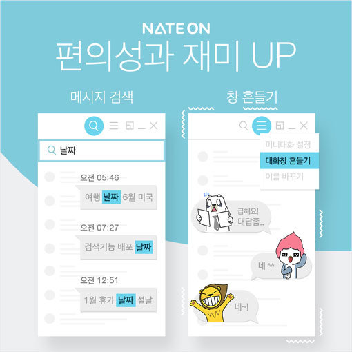 먼저 대화창 기능 편의성을 높였다. ‘대화창 내 메시지 검색’ 기능을 탑재해 일일이 찾아야 하는 수고를 덜었다. 또 ‘대화창 흔들기’라는 재미요소도 탑재했다. 답신이 없거나 미확인 상태일 경우 대화창에서 창 흔들기를 선택하면 상대방과 나의 대화창이 1~2초간 흔들리며 ‘어서 메시지 확인하고 답신줘~’라는 알람을 보낼 수 있다. 그 밖에도 네이트온을 활용하는 또 다른 기능으로 부각 중인 협업툴 ‘팀룸’에 모임별 ‘알림 설정 및 모임 설명 기능’을 추가했다.