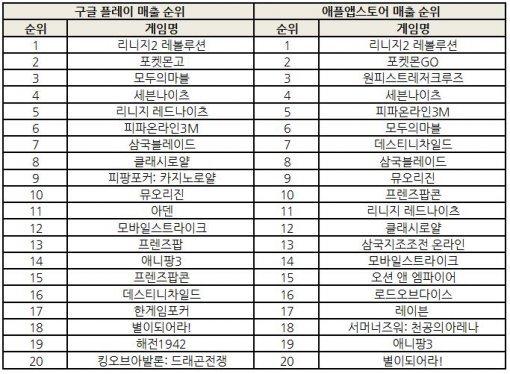 2017년 2월 10일 기준 양대 마켓 매출 순위 (자료=각 마켓)