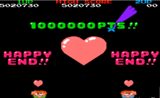 역시나 마지막은 그녀와 함께! 마왕의 머리도 함께 축하해주는 것이 포인트!!! (출처=게임동아) 꿀딴지곰 : ‘원더보이’의 엔딩은 정말 짧지요; 저렇게 여친과 정면을 보고 끝입니다; 아마도 오락실용 게임이다보니 엔딩을 보면서 시간을 끌게 하는 것 보다 동전을 넣게 하기 위해 극단적으로 엔딩을 줄인 케이스라 할 수 있겠네요.