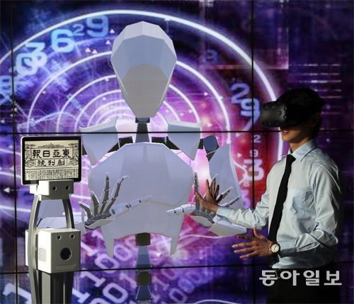 AR(증강현실) VR(가상현실) MR(혼합현실) 등이 열게 될 ‘초연결사회’에서 미래의 신문은 뉴스 콘텐츠를 어떻게 구현할까. 한국과학기술연구원(KIST) 유범재 박사가 이끄는 ‘실감교류 인체감응 솔루션’ 연구단이 1920년 4월 1일자 동아일보 창간호를 소재로 먼 거리에 있는 사람들끼리 VR 공간에서 대화하는 쌍방향 소통 기술을 시연하고 있다.