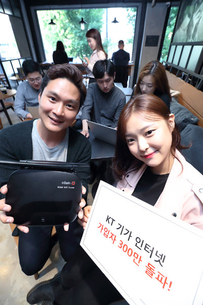 KT는 ‘기가인터넷’ 가입자가 300만을 넘어섰다고 14일 밝혔다. 300만명은 전체 KT 초고속인터넷 가입자 약860만 명 중 35%에 해당한다. KT는 또 기가인터넷 상품(500Mbps·1Gbps) 중 1Gbps 상품 신규 판매 비중은 지난해 1분기 8%에서 올해 1분기 30.9%로 증가했다고 덧붙였다. 결합상품 서비스도 큰 호응을 얻고 있다. IPTV 서비스 ‘올레tv’의 ‘tv15’ 상품과 1Gbps 기가인터넷의 결합판매는 올해 1분기 11.4%를 기록해 지난해 같은 기간보다 11% 증가했다. 또 가정용 와이파이 공유기 ‘기가 와이파이 홈’은 올해 4월 말 누적가입자 176만명으로 증가했다. 이달 22일부터 6월30일까지 KT 공식 온라인몰 ‘올레샵’에서 기가인터넷과 IPTV 등 KT 서비스를 동시 가입하는 고객 중 300명을 추첨해 이마트 상품권 등 경품을 제공한다.