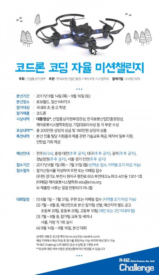 로보링크는 오는 9월 일산 킨텍스 로보월드에서 코드론을 활용한 코딩 미션 대회 본선도 진행한다. 수상자에게는 대통령상과 산업통상자원부 장관상 등이 주어진다. 또한 서울·인천을 비롯한 시도 규모의 대회와 미국·중국 등이 참여하는 세계 규모의 대회도 계획하고 있다.