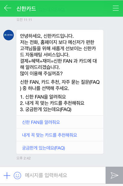 신한카드가 카카오톡·페이스북·네이버와 연계, 24시간 365일 이용할 수 있는 ‘모바일 챗봇’ 서비스(사진)를 도입했다.