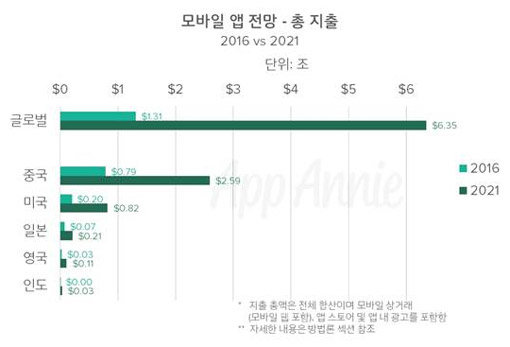 중국의 전체 앱 장터 소비자 지출은 2016년 190억 달러에서 2021년 560억 달러로 24% 성장을 예고했다. 모바일 광고 매출도 2021년 480억달러로 연평균 성장(CAGR) 36%를 기록할 전망이다. 중국 사용자들은 전체 앱 경제에서 2016년 평균 955달러를 지출했고, 2021년에는 120% 이상 증가한 2025달러로 늘어날 것으로 보인다.