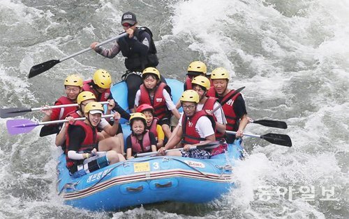 “더위야 가라” 한탄강 래프팅 낮 최고기온 33도 안팎의 폭염이 전국을 뒤덮은 2일 피서객들이 강원 철원군 한탄강에서 시원하게 물살을 가르며 래프팅을 즐기고 있다. 철원=홍진환 기자 jean@donga.com