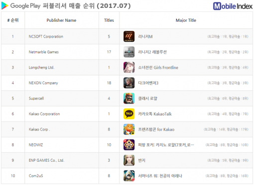 이러한 \'리니지M\'의 활약으로 국내 구글플레이 매출 기준 퍼블리셔 랭킹 순위에 변화가 나타났다. 2년 6개월 이상 1위자리를 지켜온 넷마블이 2위로 내려왔고, 엔씨소프트가 1위에 등극했다. 또한, 소녀전선을 서비스 중인 롱청은 단 한 개의 타이틀로 국내 구글 플레이 퍼블리셔 순위 3위를 기록하는 기염을 토했으며, 4위와 5위에는 넥슨과 슈퍼셀이 순서대로 이름을 올렸다.