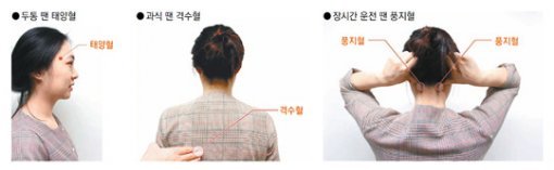 장시간 운전 또는 추석 음식 장만 등으로 인해 목이나 어깨 통증이 생길 수 있다. 이때는 목 스트레칭과 함께 지압을 해준다. 바른 자세로 한쪽 손바닥을 엉덩이로 가볍게 깔고 앉아 어깨를 고정한 상태에서 다른 손을 머리 위로 넘겨 귀를 잡고 반대쪽으로 늘려준다. 고개를 앞으로 숙인 상태, 고개를 뒤로 젖힌 상태에서 각각 늘려주면 목의 다양한 근육을 늘릴 수 있어 효과적이다. 또 귀 뒤에 튀어나온 뼈인 유양돌기에서 뒤통수뼈를 따라 목 중앙 방향으로 향하다 보면 움푹 들어간 곳인 풍지혈을 지압한다. 엄지나 세 번째 손가락으로 지그시 머리 위쪽을 향해 누르면 뒷목 두통을 줄일 수 있다.