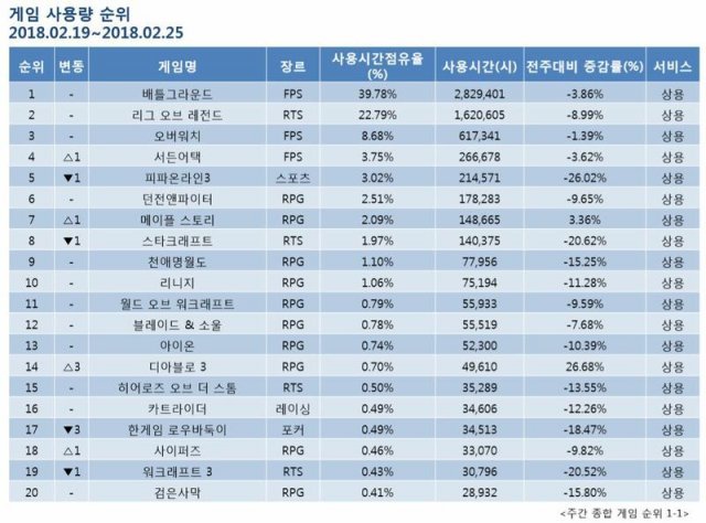 2월 4주 PC방 순위는 설연휴 종료로 인해 전반적인 사용량이 감소한 것으로 나타났다. 현재까지 1위를 고수 중인 배틀그라운드의 경우 사용량이 3% 감소했으며, 리그오브레전드(이하 LOL) 역시 8% 이상 감소한 것으로 나타났다.