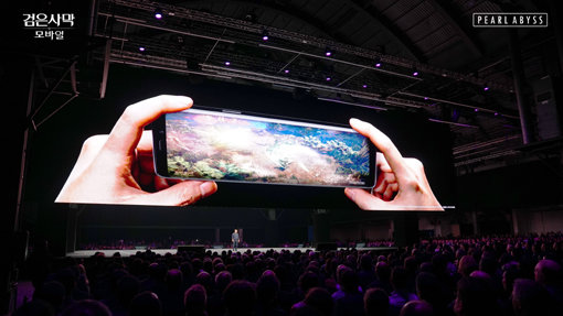 25일(현지시간) 스페인 바르셀로나서 열린 삼성전자 갤럭시S9 언팩 행사에서 공개된 ‘검은사막 모바일’ 전투 영상. 사진제공|펄어비스