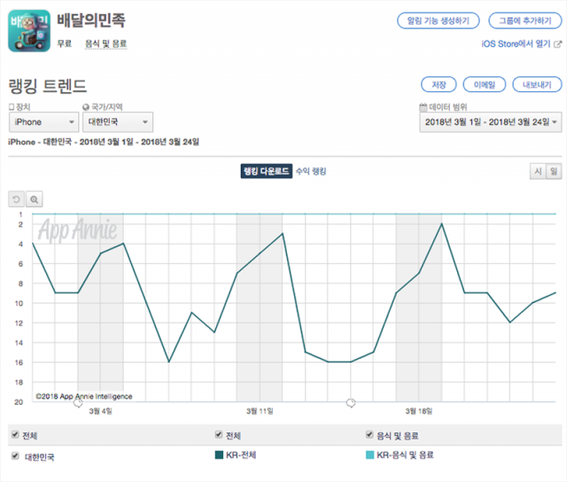 배달의 민족 3월 다운로드 수 기준 순위 변동(출처=앱애니) 구글 플레이