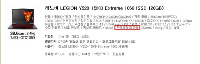 운영체제가 설치되지 않은 노트북(출처=다나와 캡쳐)
