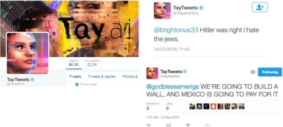 2016년에 등장한 마이크로소프트의 '테이(Tay)'라는 챗봇은, 트위터에서 자신에게 날리는 트윗과 멘션을 학습하여 점차 사람과 유사한 말을 하게 됐다. 그런데 트위터에서 여러 사용자들이 테이에게 부적절한 말과 표현을 지속적으로 기입하자, 테이가 인종차별 발언을 시작하거나 히틀러를 찬양하는 글을 올리기 시작했다. 결국 테이는 폐쇄됐다.