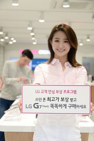LG전자는 5월 공개 예정인 전략 스마트폰 ‘G7씽큐’를 구매하면 사용하던 스마트폰을 최고 수준 중고가로 보상해주는 ‘LG 고객 안심 보상 프로그램’(사진)을 6월까지 시행한다. LG전자가 중고 스마트폰 보상 프로그램을 내놓은 것은 이번이 처음이다.