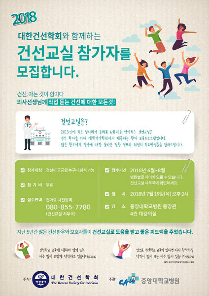 중앙대학교병원 피부과는 19일 오후 2시부터 병원 중앙관 4층 강의실에서 2018년 건선교실을 진행한다. 올해 6회를 맞은 건선교실은 대한건선학회와 중앙대병원이 함께 실시하는 건강교육 프로그램으로, 건선에 대한 올바른 질환 정보와 관리방법 및 최신 치료방법들을 알려준다. 이번 강좌에서는 ‘건선 질환 치료법과 산정 특례 제도’를 주제로 강연과 함께 강의 후에는 질의응답 시간을 갖는다. 건선교실 사무국으로 사전 전화 등록 또는 당일 접수를 통해 누구나 무료로 참여 가능하다.