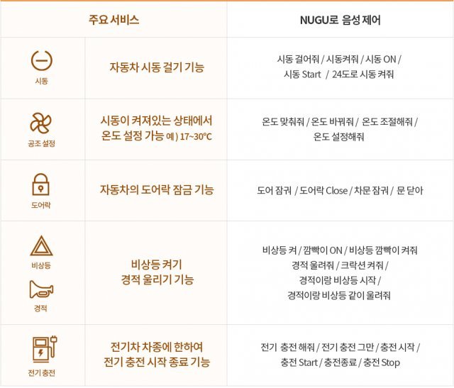 이번 서비스 주요 기능은 ▲시동 온오프 ▲문열림/잠금 ▲비상등 점멸 및 경적울림 ▲온도설정 ▲전기차 충전 시작/중지 5가지이다. NUGU를 통해 음성으로 제어할 수 있다. ‘홈2카’ 기능을 통해 운행 전 미리 시동을 걸어 예열하거나 요즘과 같이 더운 날씨에는 차량온도를 시원하게 조절하는 기능도 있다.