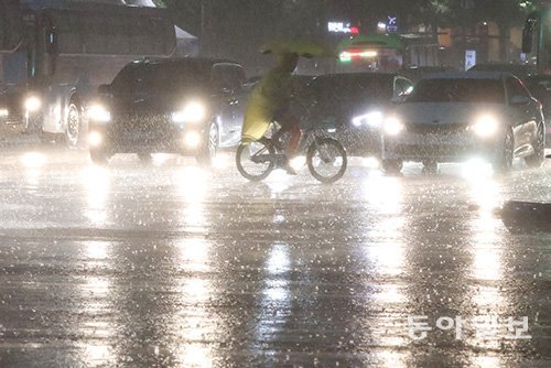 28일 저녁 서울을 비롯한 중부지방에 집중호우가 내렸다. 시민들이 광화문 네거리 횡단보도를 건너고있다. 사진=동아일보 DB