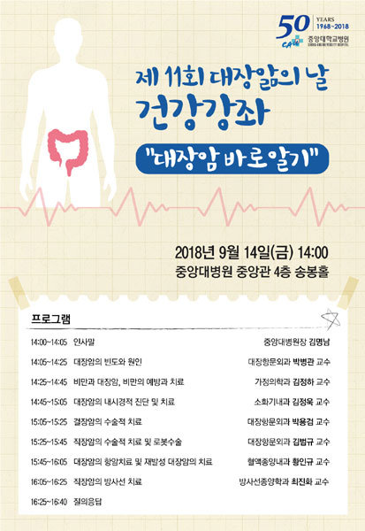 중앙대학교병원은 9월14일 오후 2시부터 병원 중앙관 4층 송봉홀에서 ‘대장암 건강강좌’를 개최한다. 이번 강좌는 ▲ 대장암의 빈도와 원인 ▲ 비만과 대장암, 비만의 예방과 치료 ▲ 대장암의 내시경적 진단 및 치료 ▲ 결장암의 수술적 치료 ▲ 직장암의 수술적 치료 및 로봇수술 ▲ 대장암의 항암치료 및 재발성 대장암의 치료 ▲ 직장암의 방사선 치료 등의 내용으로 진행된다. 사전 예약 없이 누구나 참석 가능하다.