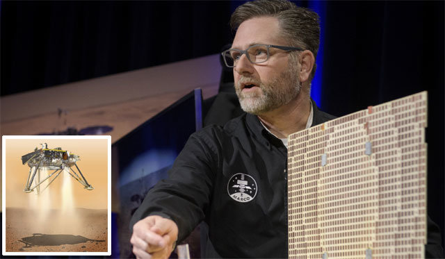 미국항공우주국(NASA) 소속 연구원이 25일(현지 시간) 미국 캘리포니아의 NASA 제트추진연구소에서 새로운 화성 착륙선 ‘인사이트’와 동반 소형 위성 ‘마르코’의 임무를 설명하고 있다. 인사이트는 2008년 ‘피닉스’ 이후 10년 만에 화성 땅을 밟게 된 고정형 화성 탐사선으로, 27일부터 약 2년 동안 지진계와 지하 열탐지기를 통해 화성의 내부 구조와 형성 원인을 연구한다. 작은 사진은 화성 적도 부근 ‘엘리시움 평원’에 착륙하는 인사이트의 상상도.